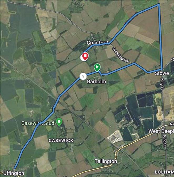 Start on Belmesthorpe/Greatford road east of railway crossing proceed to Greatford -take left turn toward Carlby -at junction with A6121 turn left to Essendine -take left towards uffington then left towards Barholm -turn left before Barholm to finish short of T junction with Belmesthorpe/Greatford road.